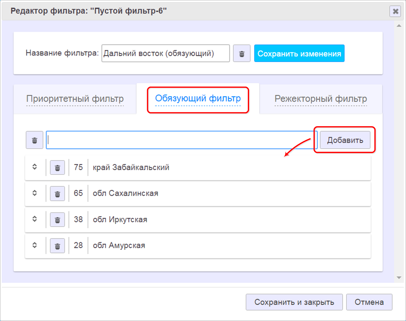 Само заполнение фильтра адресными объектами выполняется аналогично тому, как это делается для приоритетного фильтра: вводим имена адресных объектов и нажимаем кнопку «Добавить». В приведенном примере мы создали фильтр с названием «Дальний Восток (обязующий)» и добавили в него несколько регионов Дальнего Востока России.